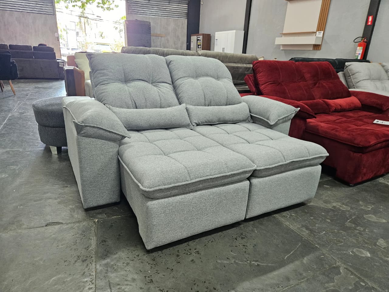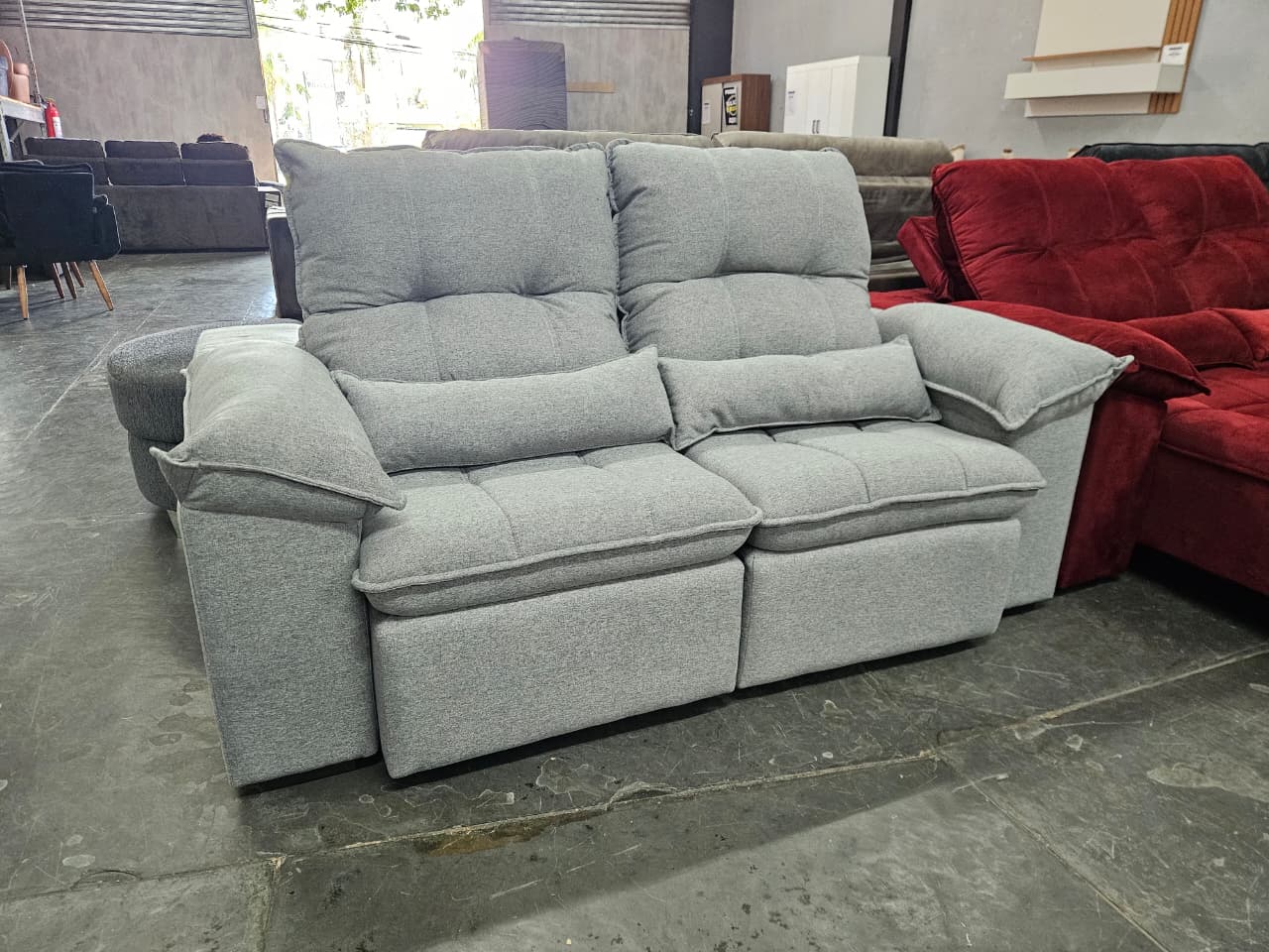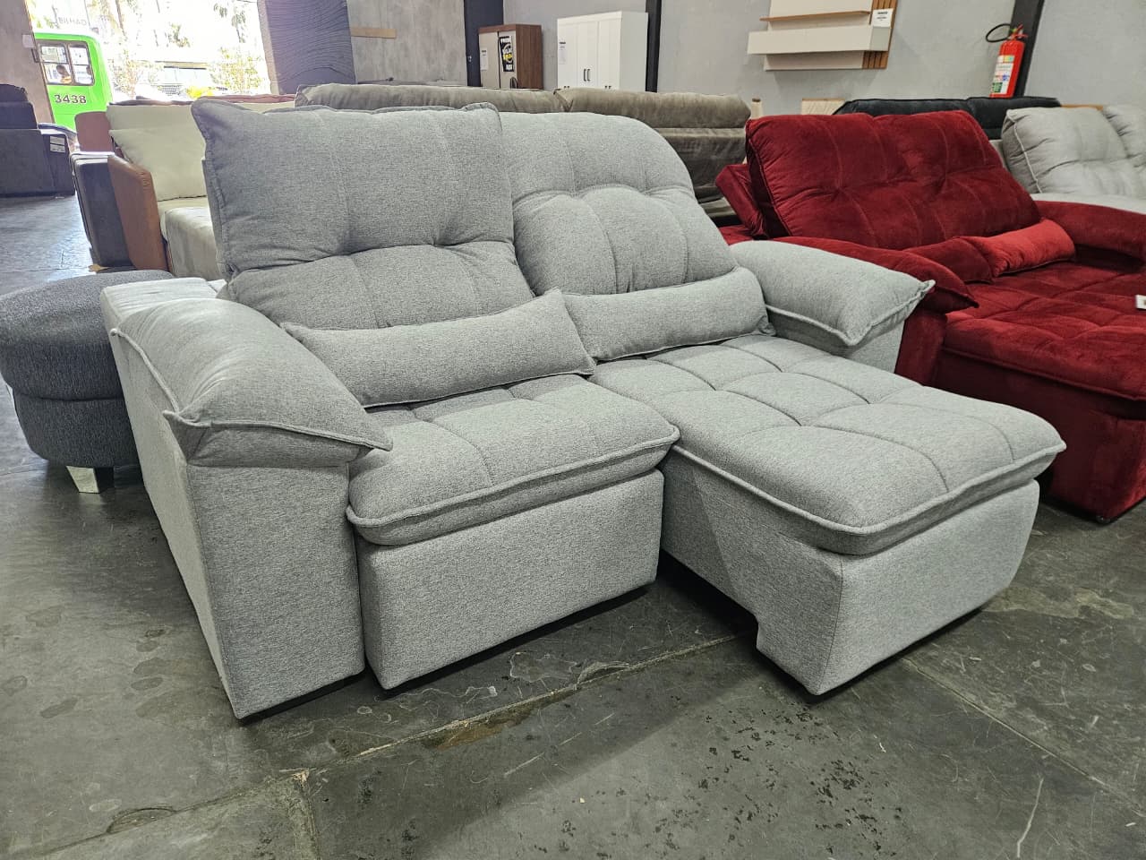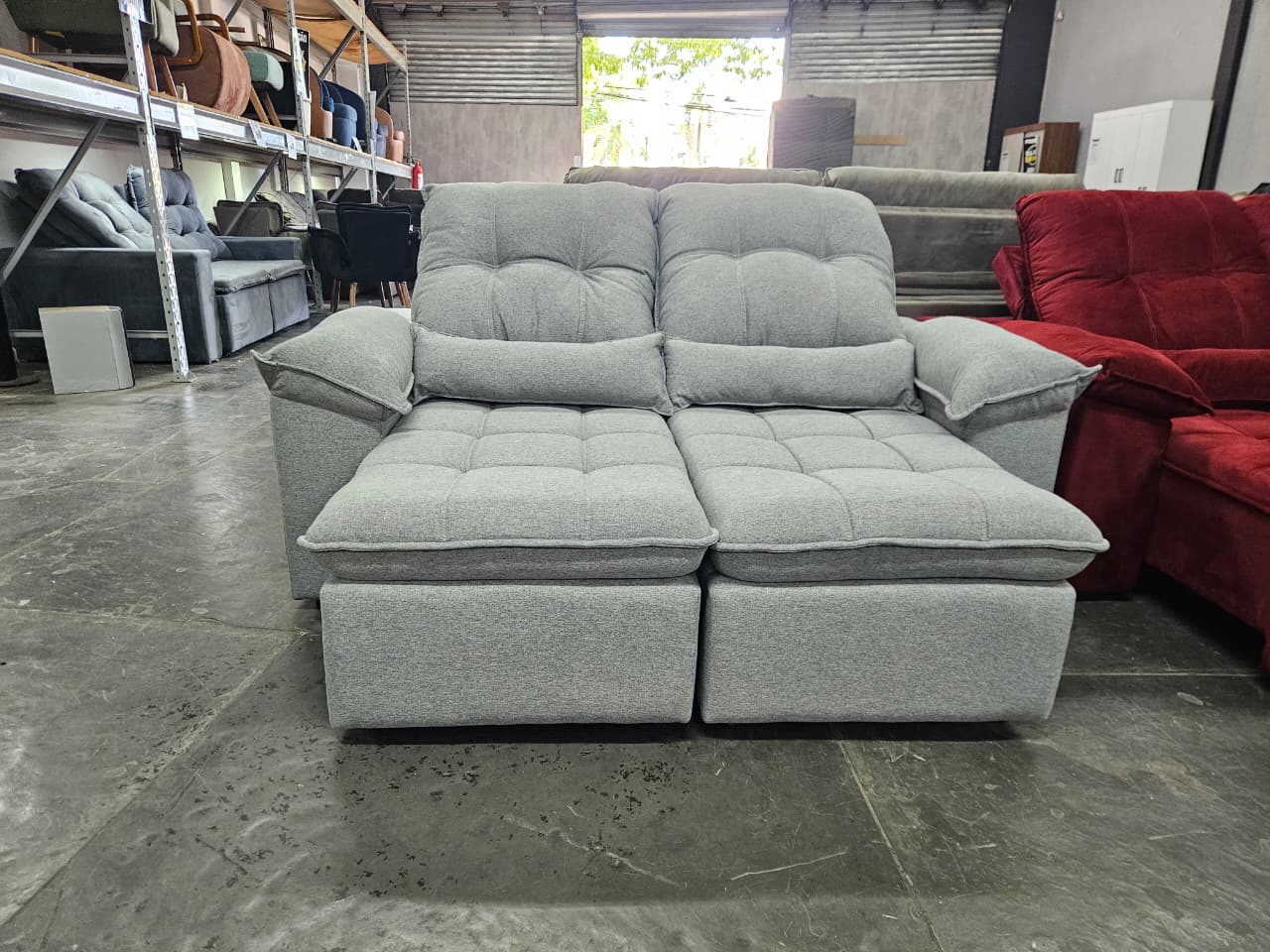 • Assento: Retrátil, mecanismo metálico em espuma D-28 com molas de sustentação espiral e ensacadas, solda dupla, manta acrílica e percintas elásticas, suportando até 150Kg por assento.